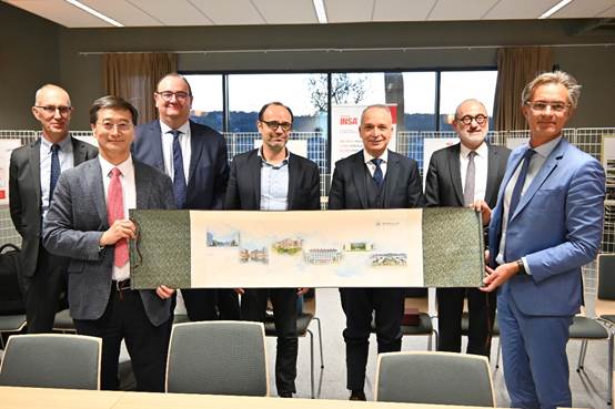 王云鹏一行还与法国国立应用科学学院(以下简称“INSA”)集团进行会谈,INSA集团主席兼INSA图卢兹校长贝尔唐·哈盖(Bertrand RAQUET)、INSA里昂校长佛雷德里克·弗提亚都(Frédéric FOTIADU)、INSA雷恩校长文森特·布鲁尼(Vincent BRUNIE)、INSA鲁昂校长穆拉德·布哈法(Mourad BOUKHALFA)、INSA斯特拉斯堡校长罗穆阿尔德·博内(Romuald BONÉ)及INSA上法兰西校长阿尔梅尔·德·拉·布尔东奈(Armel De la BOURDONNAYE)等6位校长参加了会谈。与会人员研究讨论了双方杭州合作办学有关的培养方案、课程设置、师资队伍等核心问题,王云鹏代表学校与INSA集团签署合作办学备忘录,与INSA图卢兹签署校级合作备忘录及学生交换协议,与INSA里昂签署学生交换协议,取得了多项成果。