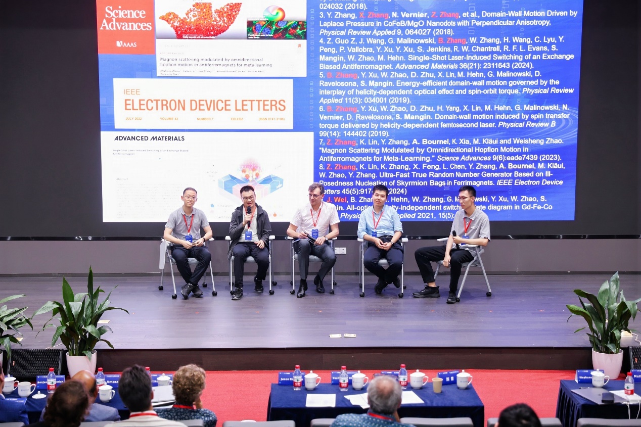 在为期三天的研讨会中,三十余位国际专家展示了他们在自旋电子存储与计算等领域的最新研究成果,为广大师生带来了一场精彩纷呈的学术盛宴。法国巴黎萨克雷大学Albert Fert教授、法国Spintec研究院Thierry Valet教授、韩国浦项科技大学Hyun-Woo Lee教授、法国巴黎萨克雷大学Vincent Cros教授和巴西佩尔南布科联邦大学Antonio Azevedo教授分别从理论和实验的角度介绍了轨道电子学的物理机制和应用方向。法国费尔实验室Romain Lebrun教授、德国雷根斯堡大学Joerg Wunderlich教授、德国柏林自由大学Tobias Kampfrath教授、英国剑桥大学Jason Robinson教授、韩国科学技术院Kyung-Jin Lee教授、德国美茵茨约翰内斯·古腾堡大学Mathias Klaui教授展示了反铁磁材料在存储器件、超导、太赫兹发射、自旋振荡器等方向的研究。荷兰埃因霍芬理工大学Bert Koopmans教授、法国洛林大学Stephane Mangin教授介绍了全光翻转磁矩的物理机制和器件集成方法。西班牙纳米科学合作研究中心Felix Casanova教授和法国洛林大学Carlos Rojas-Sanchez教授探讨了二维材料在电荷-自旋转化及磁电逻辑器件中的应用。德国杜伊斯堡-埃森大学Samir Lounis教授、意大利墨西拿大学Giovanni Finocchio教授和奥地利维也纳科技大学Amalio Fernandez-Pacheco教授分享了手性磁材料和的原理及应用。