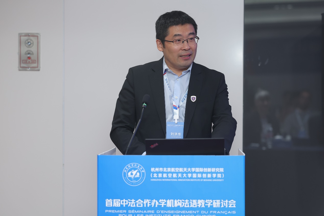 教育部大学外语教学指导委员会委员、山东大学外国语学院副院长刘洪东分享了他对中法合作机构法语教学的洞察,并以“高质量发展”为关键词,从法语教师的个人发展和人工智能对法语教学的影响两方面提出了切实的建议和深刻的思考。他指出,法语教学质量是中法合作机构可持续发展的关键因素之一,希望各中法合作机构充分交流,加强合作,不断提升法语教学质量。