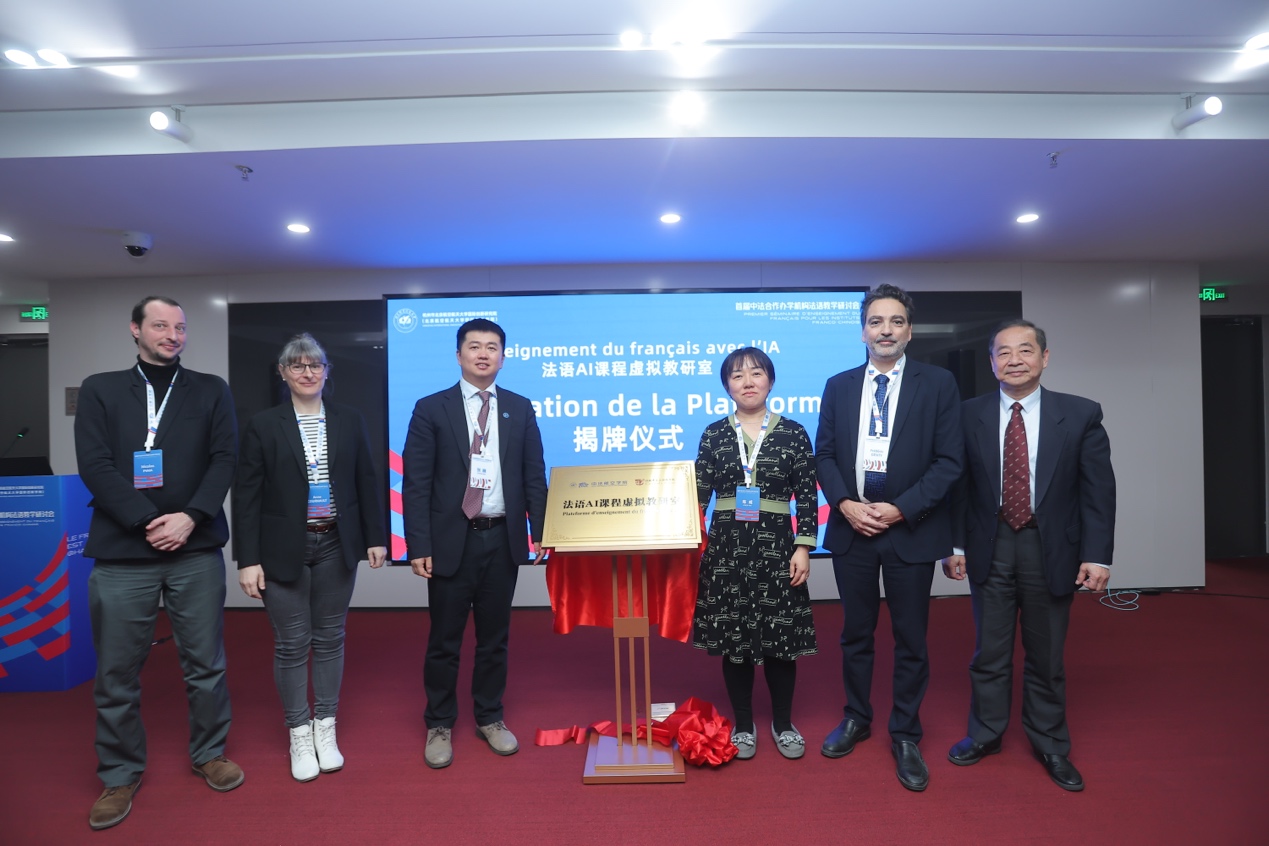 会上,曹德明、让帝(Frédéric Genty)、张巍、陈威等领导嘉宾共同为法语AI课程虚拟教研室揭牌。教研室由中法工程师学院与中法航空学院联合打造,未来将利用人工智能技术为学生提供个性化、互动性强的法语学习体验,共建人工智能时代法语教育新未来。