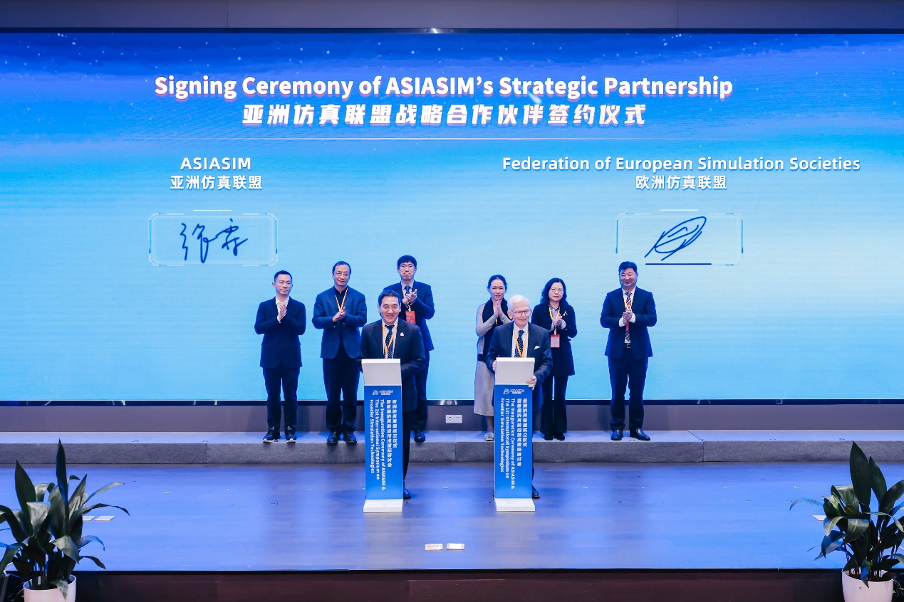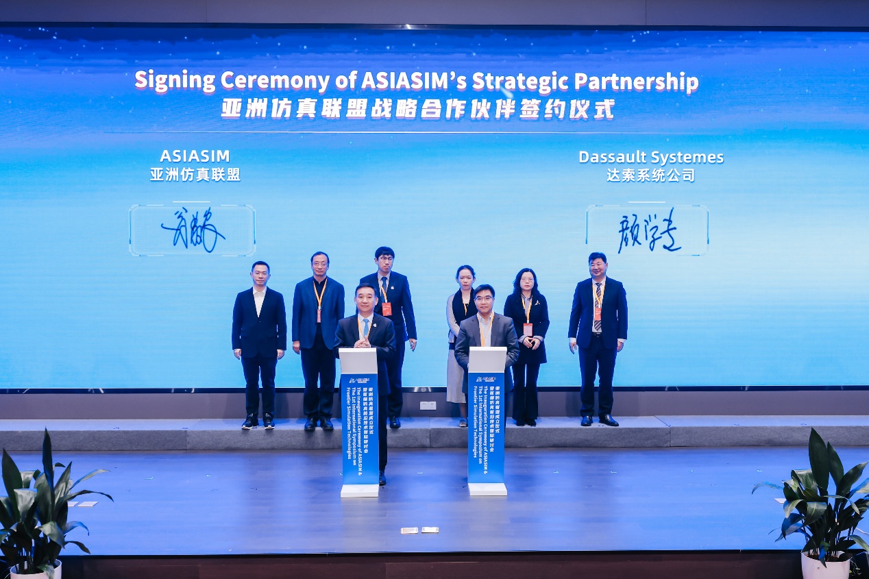亚洲仿真联盟首任理事长张霖同欧洲仿真联盟代表勒曼、亚洲仿真联盟首任秘书长翁敬农与全球仿真技术领军企业达索系统公司大中华区首席技术总监颜学专签署战略伙伴合作协议。