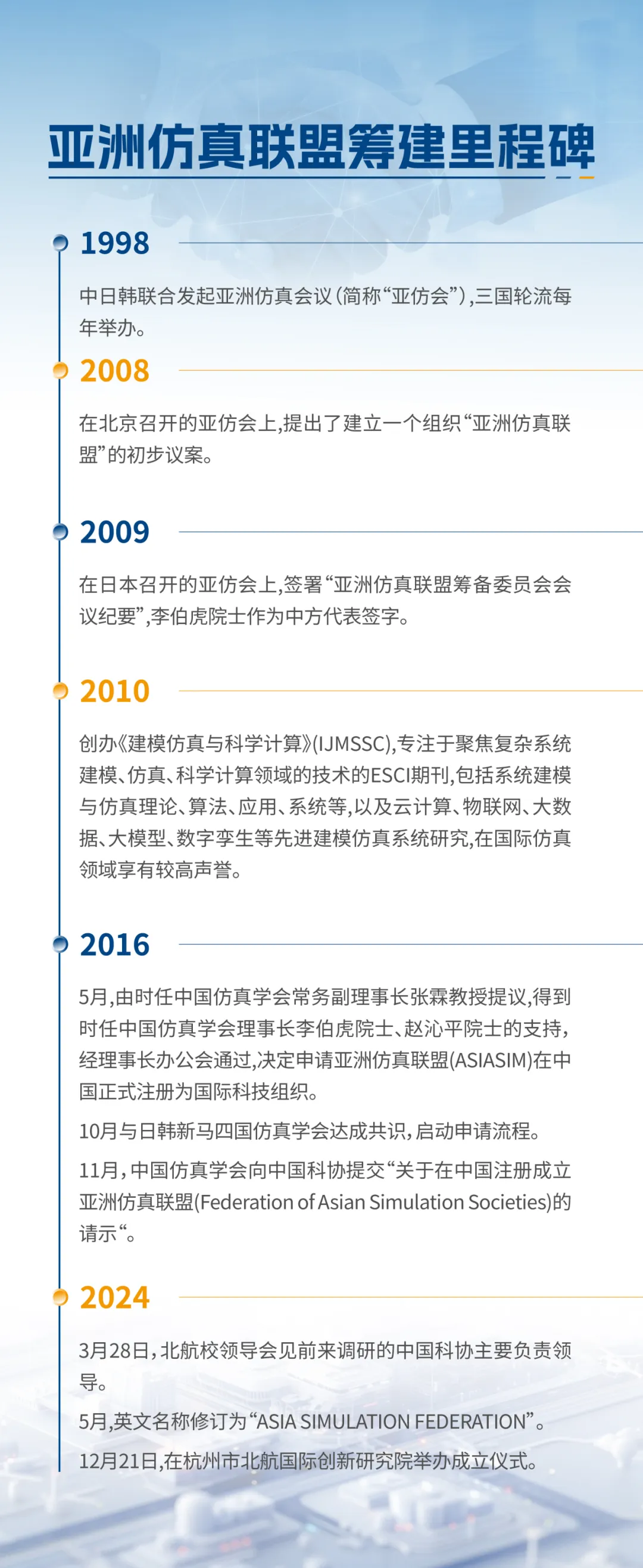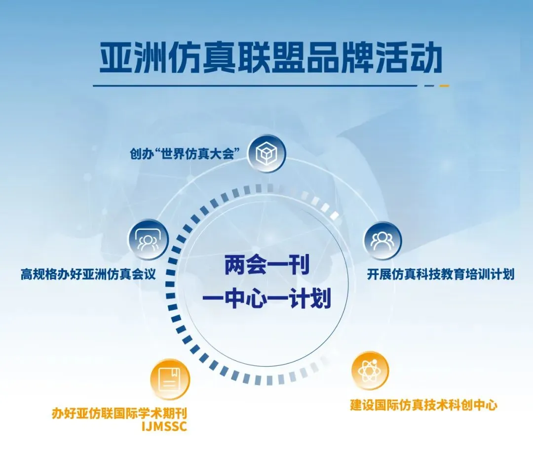 亚洲仿真联盟是由中国仿真学会、日本仿真学会、韩国仿真学、新加坡仿真学会、马来西亚仿真学会共同发起,在李伯虎院士、赵沁平院士、张霖教授等的持续推动下,历经8年申请,在中国科学技术协会和民政部的大力支持下,于民政部登记注册成为具备独立法人资质的国际性、非营利性国际学术组织。