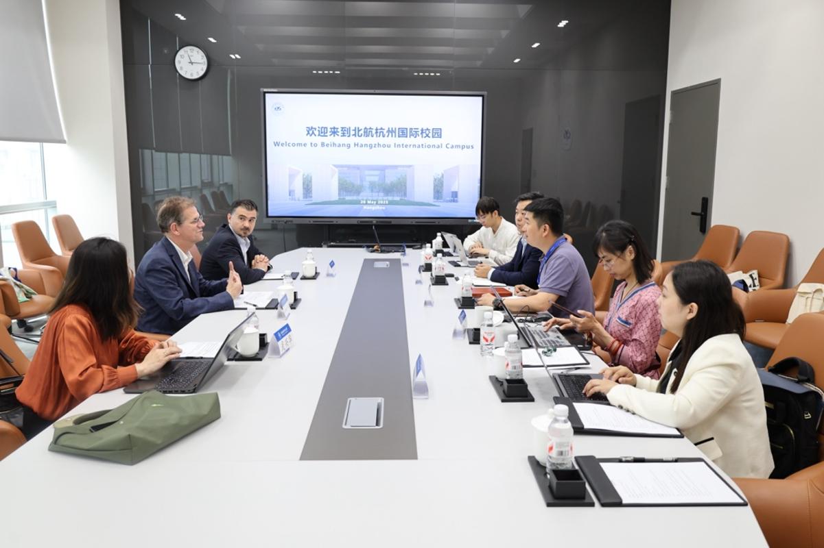 5月20日,法国巴黎电子与计算机信息工程师学院(EFREI Paris)副校长埃马纽埃尔·彼得(Emmanuel Peter)、数据与人工智能系主任系主任萨利姆·纳勒(Salim Nahle)到访北航杭州国际校园。北航国新院院长董卓宁、副院长张巍、国际合作办公室主任陈超与代表团会面,数据科学与智能计算科教平台李莹副教授、王帅副教授等参加会谈。