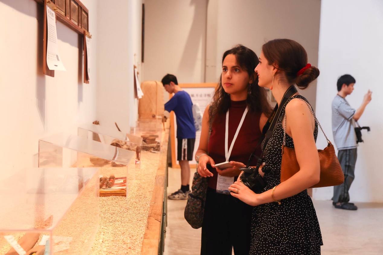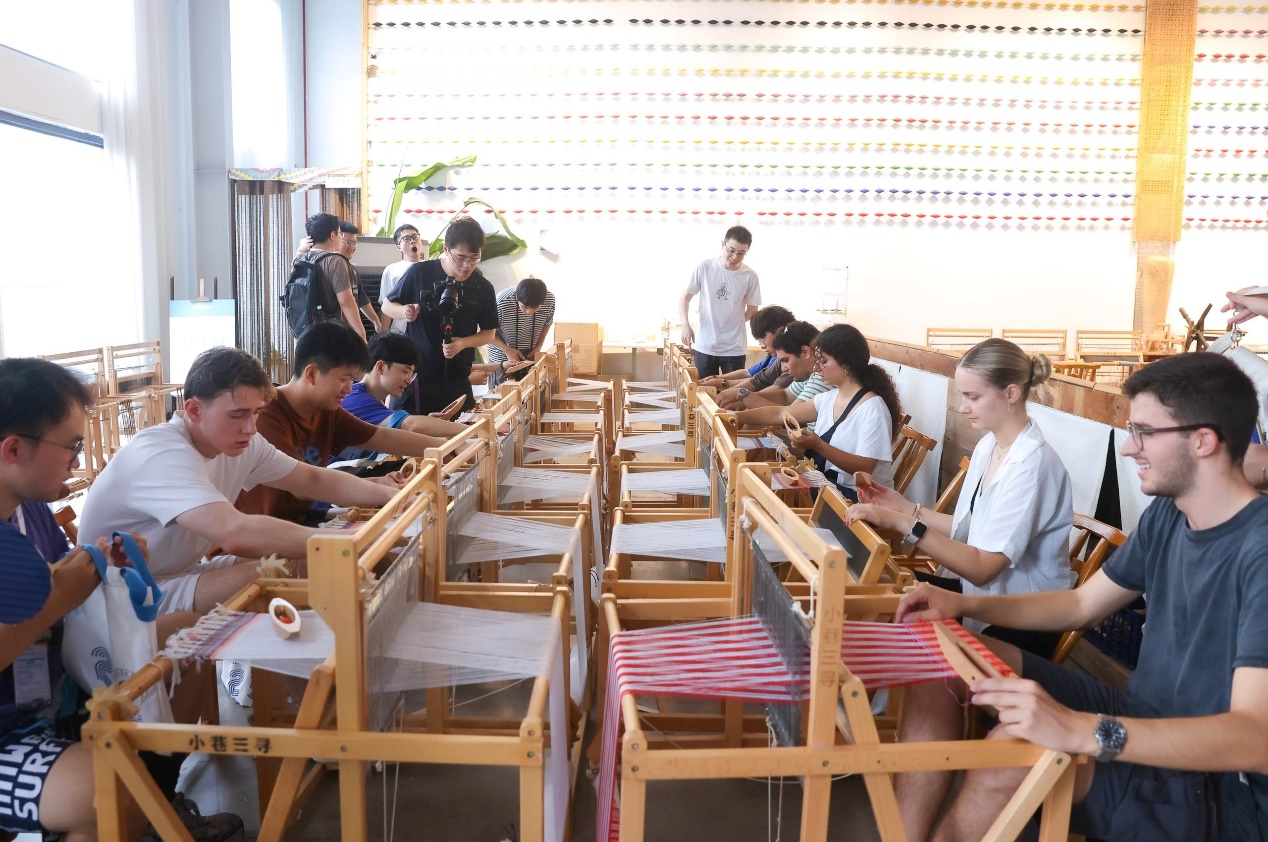 随后,学员们来到传梭博物馆,这座国内唯一的纺梭主题博物馆,收藏了馆长郑芬兰(土布纺织技艺省级非遗传承人)二十余年来从全球收集的2.3万余把历史梭具,讲述着以梭为载体的文化故事。学员们带着对“光阴如梭,一往无前”的体悟展开探索,见证了承载民族情谊的“初心之梭”(来自西藏老妪的赠礼),观察了从木、竹、牛角到金银、塑料等多元材质制成的梭具,了解了梭用于编织葛、麻、棉、竹皮等天然纤维的“万物皆可织”智慧,认识了梭具在中国古代皇家织造及现代苏州织锦中的核心作用。在纺织体验区,学员们在指导下,实践传统织布口诀“同手同脚”,感受手工织造的韵律。