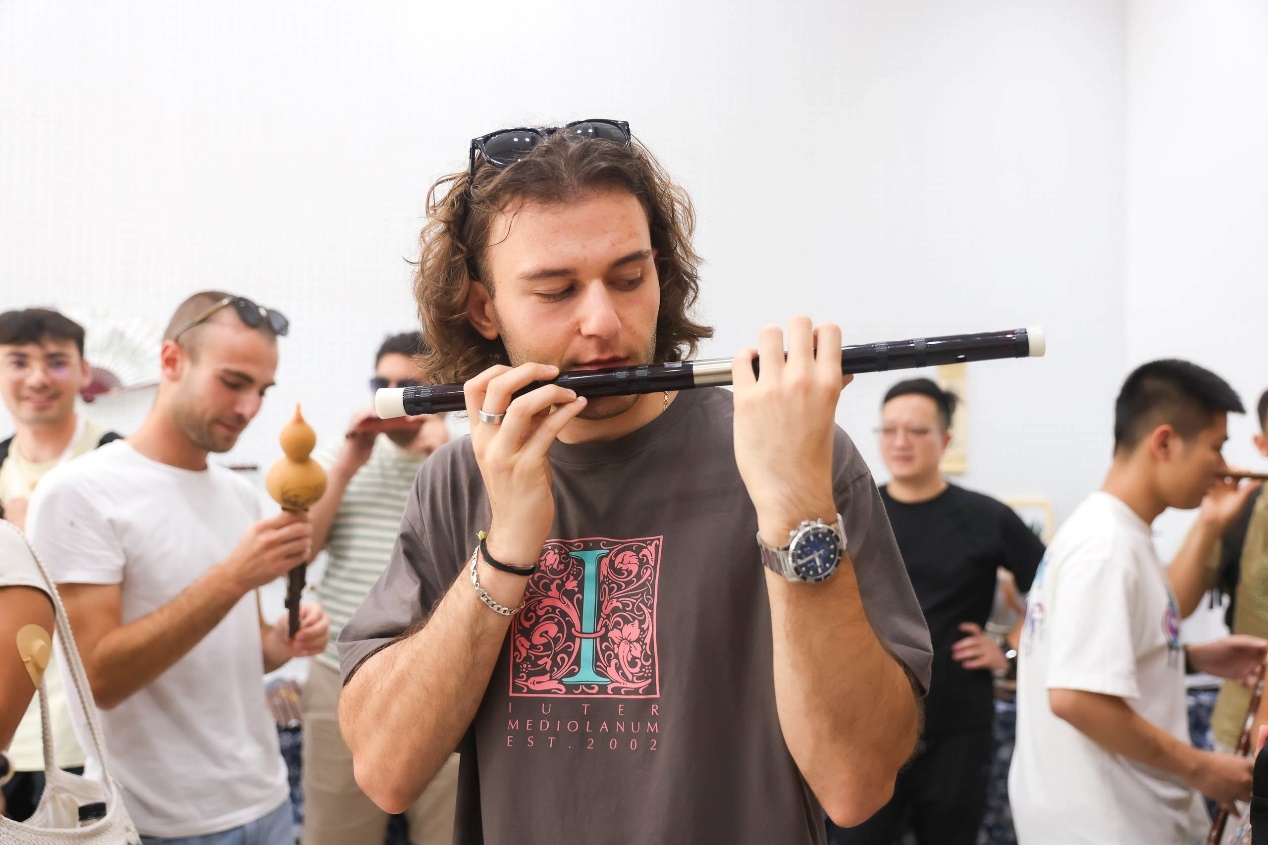 笛艺大师现场演奏了三首乐曲,《我心永恒》的悠扬、《梁祝·化蝶》的缠绵、《女儿情》的婉转,充分展现了竹笛跨越文化的情感表现力。在五位专业匠人的指导下,学员们参与了画基准线、定位孔位置等关键步骤,之后五位专业师傅负责开孔、修孔与贴膜调音,再由学员们精细打磨笛身,一根竹笛便制作完成。当工坊内陆续响起学生们亲手制作的竹笛声,简单的《两只老虎》旋律令大家惊喜不已。馆长在赠言中寄托厚望:“愿这支竹笛成为文化信使,让中国笛声传遍世界。”