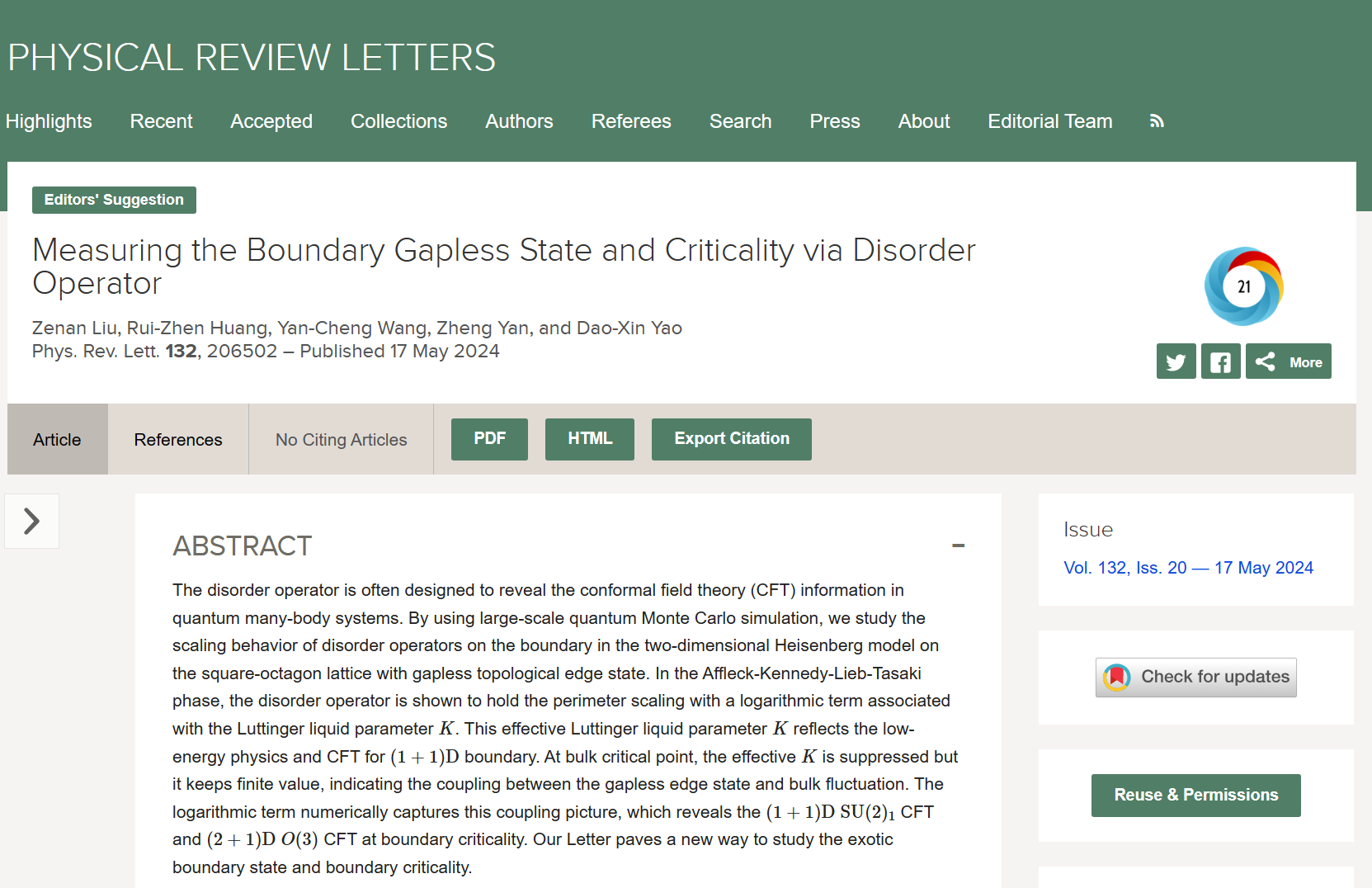 5月17日,该成果以“Measuring the boundary gapless state and boundary criticality via disorder operator”为题,发表于国际著名物理刊物《物理评论快报》 Physical Review Letters 132, 206502 (2024),并获得编辑推荐(Editor’s suggestion)。审稿人对这项研究给予了高度评价,认为该项工作首次进行了表面临界的非局域物理量的测量尝试,并且给出了边缘模式与体内模式的耦合形式,对表面临界研究将有重要的指导作用,为理解表面临界行为提供了新的工具和视角。