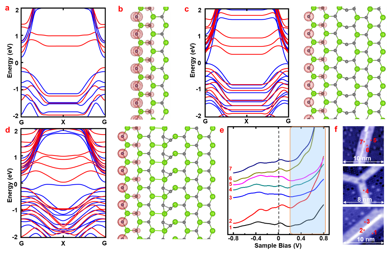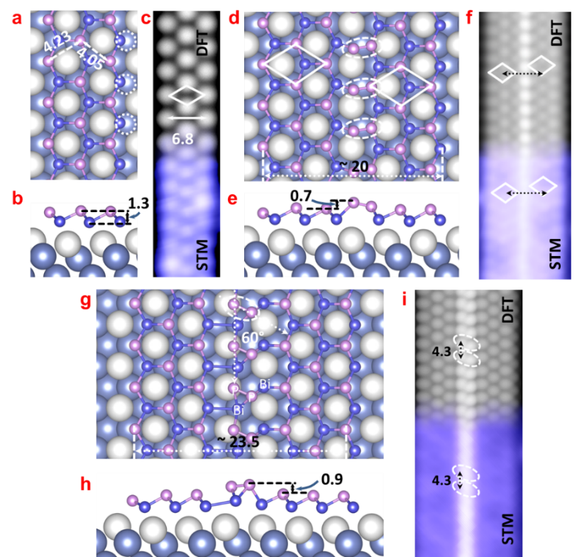 为了确定纳米带的原子结构模型,团队开展了一系列基于密度泛函理论(DFT)的第一性原理计算。计算结果表明,Bi和P原子结合形成环扣结构的β相纳米带(图3),翘曲高度为0.13 nm,宽度为0.69 nm,Bi和P原子分别位于底层和上层。其中一侧边界处的P原子向内偏移了0.2 Å,导致上层P原子呈现不同的原子间距(4.05 Å/4.23 Å)。对于Ⅱ型与Ⅲ型纳米带,中间线性凸起分别为P原子链与Bi-P-Bi-P重复单元,连接着两侧的I型纳米带。所有基于原子结构模型模拟的STM图完美复现了实验结果。