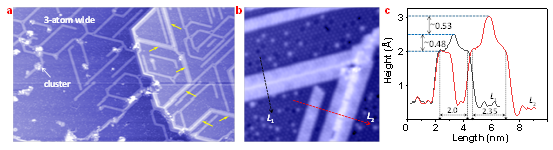 在衬底台阶边缘及晶界位置上,存在两种宽度超过三原子的纳米带(图2),二者的中心位置存在明显的线性凸起。第一种纳米带宽度为2.0 nm,中心凸起达到0.48 nm(Ⅱ型纳米带);第二种纳米带宽度为2.35 nm,中心凸起约为1.0 nm(Ⅲ型纳米带)。