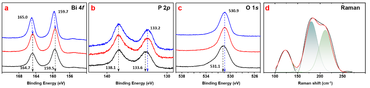 图4. BiP纳米带样品的XPS表征与Raman光谱表征