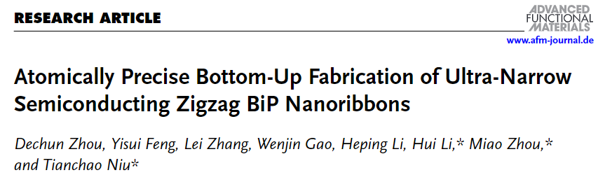 2024年4月,Wiley旗下学术期刊Advanced Functional Materials在线刊登杭州北航国际创新研究院(学院)为第一单位的最新研究成果Atomically Precise Bottom-Up Fabrication of Ultra-Narrow Semiconducting Zigzag BiP Nanoribbons。这一成果将VA族的P和Bi元素组合成新型的一维半导体纳米带。在β相铋烯表面,通过沉积P并进行退火处理,成功制备了宽度仅为三个原子的超窄BiP纳米带。理论计算中,BiP纳米带具有0.38 eV的带隙宽度,且在“zigzag”边界处存在自旋极化态,这些特征使得BiP纳米带在自旋电子学器件应用中有巨大的潜力,同时该工作为自下而上高效制备低维材料提供了新的路径。周德春博士(目前为新加坡国立大学物理系博士后研究员)、北京化工大学软物质科学与工程高精尖中心博士生冯一绥为共同一作,杭州北航国际创新研究院(学院)周苗教授、牛天超副教授与北京化工大学软物质科学与工程高精尖中心李晖教授为共同通讯作者。
