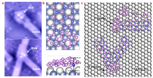 衬底在纳米带形成过程中具有至关重要的作用。由于二维β相BiP与β相铋烯衬底间的晶格失配,二维结构难以形成,BiP纳米带以自约束的模式生长。基于实验结果团队建立了生长模型:P团簇同时具有催化剂与原料的作用(自催化过程)(图6)。团簇中的P原子与相邻原子成键形成黑磷片段,端部P原子向上翻卷(5.43 Å高)。从动力学角度分析,由于P在β相铋烯表面极低的扩散势,BiP纳米带可在0.3单层到满覆盖的P团簇的宽P/Bi区间内形成,无需对覆盖度进行精确调控,易于实现高效制备。