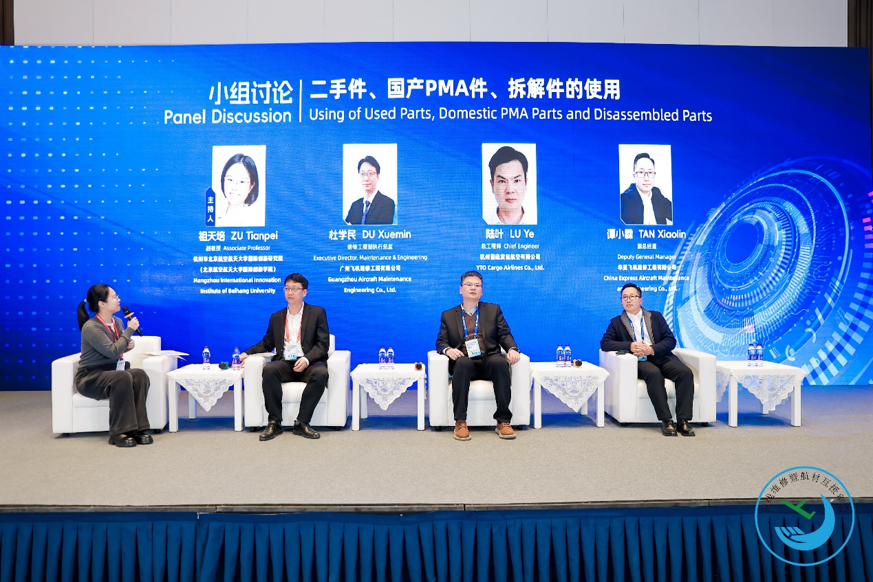 广州飞机维修工程有限公司维修工程部执行总监杜学民、杭州圆通货运航空有限公司总工程师陆叶、北京飞机维修工程有限公司航材部AOG管理分部经理王利强、海南航空控股股份有限公司采购部航材控制中心经理陈金强、GA Telesis, LLC 亚太业务拓展高级副总裁 Lynda CHENG、欧航(北京)航空器材有限公司销售总监程菲菲、广州飞机维修工程有限公司复合材料修理中心总监赖勇、土耳其 my TECHNICAL维修公司董事长吕宇鹏等嘉宾围绕“二手件、国产PMA件、拆解件的使用”、“AOG航材保障快速响应策略探讨”、“如何应对航材供应链卡脖子问题”和“维修新技术开发与应用”这四个主题进行了交流探讨。其中,“二手件、国产PMA件、拆解件的使用”分论坛由北航国新院智慧民航科创中心祖天培副教授主持,与来自三家航司的资深专家探讨了航空二手件、PMA件和拆解件的质量与可靠性问题。