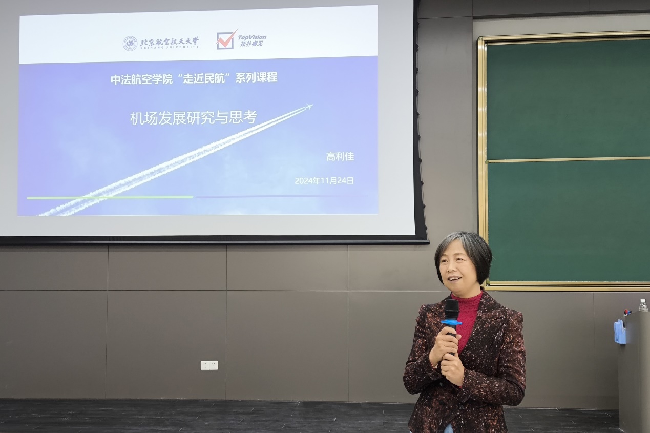 (通讯员/康雨涵 图文/高昀琦)11月24日,由北航国新院智慧民航科创中心主办、拓扑睿见咨询公司协办的《走近民航》系列讲座第八讲在北航杭州国际校园成功举办。本次讲座特别邀请了科技部“综合交通运输与智能交通”专家组专家、原首都国际机场公司常务副总经理兼党委书记高利佳女士担任主讲嘉宾。高利佳女士毕业于北京亚洲成人在线一二三四五六区,主编了四型机场建设指南,曾担任大兴机场建设指挥部副指挥长,并多次荣获国家级科技进步奖。她结合个人多年丰富的行业经验,为在场师生带来了一场题为《机场发展研究与思考》的精彩讲座。