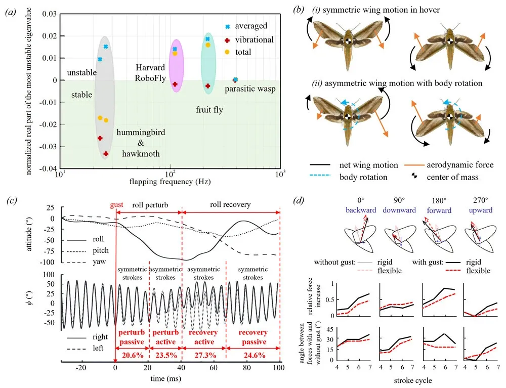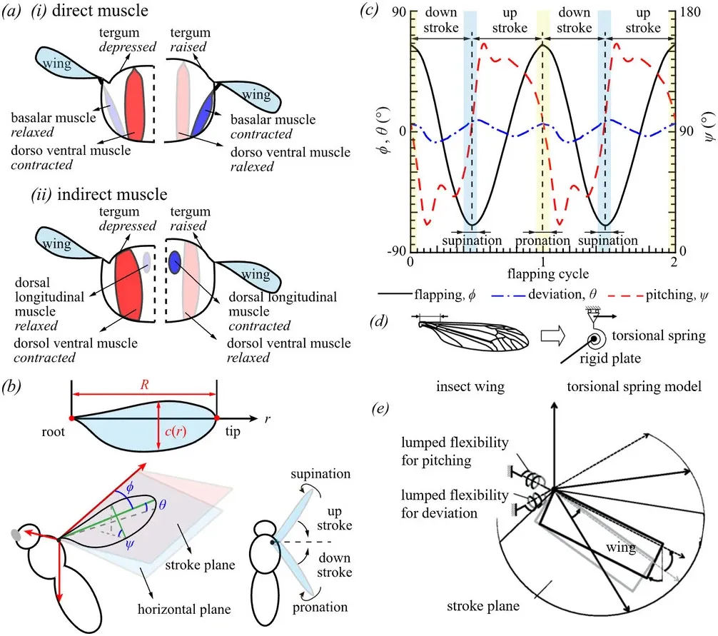 昆虫通过翅膀运动产生支持飞行的升力。身体两侧的翅膀通过胸腔内部的特殊结构实现机械联动,保持运动的同步和协调。同时,源于自身的材料柔性和褶皱结构,翅膀在运动过程中与周围空气相互作用而自发地变形,有助于增强升力、提升能量利用效率。在遭遇气流扰动时,气动阻尼伴随身体旋转而产生,帮助昆虫应对飞行稳定的挑战。被动机制与主动控制相辅相成,共同塑造了昆虫非凡的飞行本领。