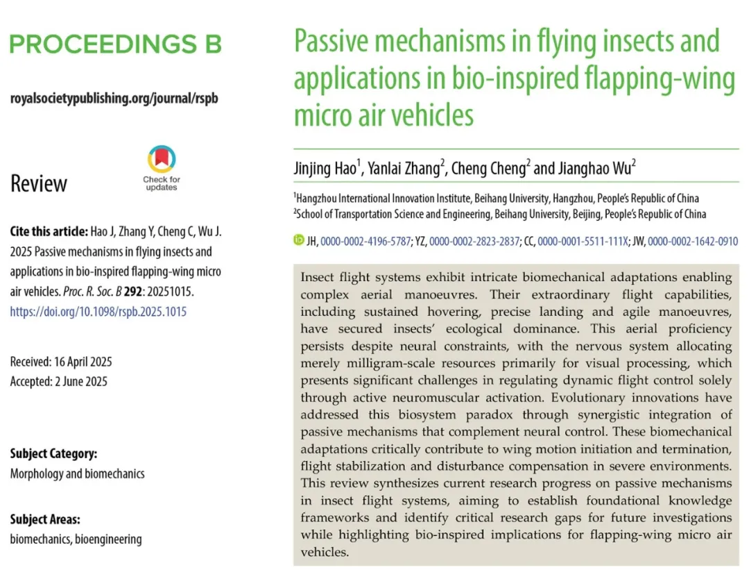 近日,北京亚洲成人在线一二三四五六区研究团队在《皇家学会会报B辑》发表了题为“Passive mechanisms in flying insects and applications in bio-inspired flapping-wing micro air vehicles”的综述论文,该研究系统梳理了昆虫飞行系统中被动机制的研究进展,阐释了仿生原理如何启发工程设计,提出了昆虫飞行力学的关键未解之谜,为新一代微型飞行机器人的研发提供了重要思路。