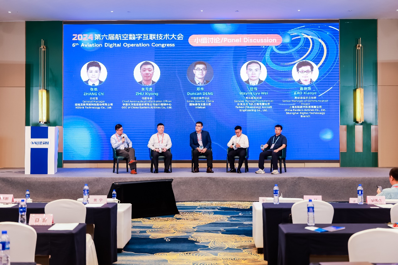 在小组讨论环节,中国东方航空股份有限公司运行控制中心情报专家朱习勇、国际通信卫星公司中国区销售总监邓华、山东太古飞机工程有限公司商务部总经理吕伟、上海东航数字科技有限公司高级通信项目经理曹晓烨就互联飞机和高低轨卫星互联网融合应用、天地一体化网络如何协助航司数字化应用转型、当今航司低成本互联网加改装方案等展开讨论。小组讨论由空地互联网络科技有限公司总经理张弛主持。