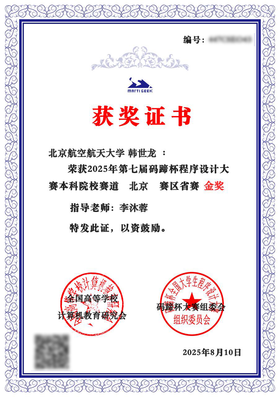 在本次省赛中,北航斩获了33枚奖牌,其中金奖6枚。依托北航国新院医工交叉科创中心,韩世龙同学凭借扎实的编程功底与出色的问题解决能力,在本科院校赛道&青少年挑战赛道提高组中脱颖而出,摘得省赛金奖,彰显了中心学生在计算机编程领域的强劲实力。