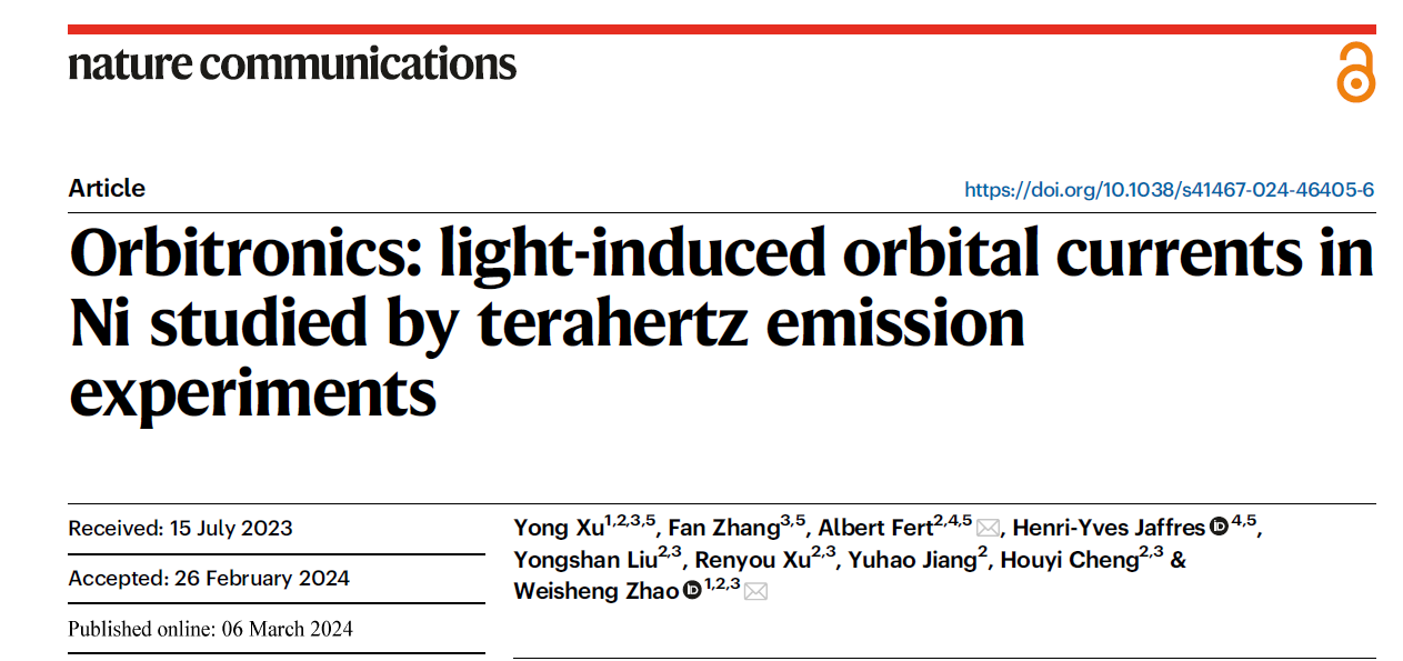 近日,杭州市北京亚洲成人在线一二三四五六区国际创新研究院自旋芯片与技术全国重点实验室赵巍胜教授团队与巴黎萨克雷大学Albert Fert教授团队合作,在轨道电子学领域取得重要进展。团队提出了一种基于光诱导轨道流产生并发射太赫兹的新实验方法,在Ni/NM/MgO多层膜体...