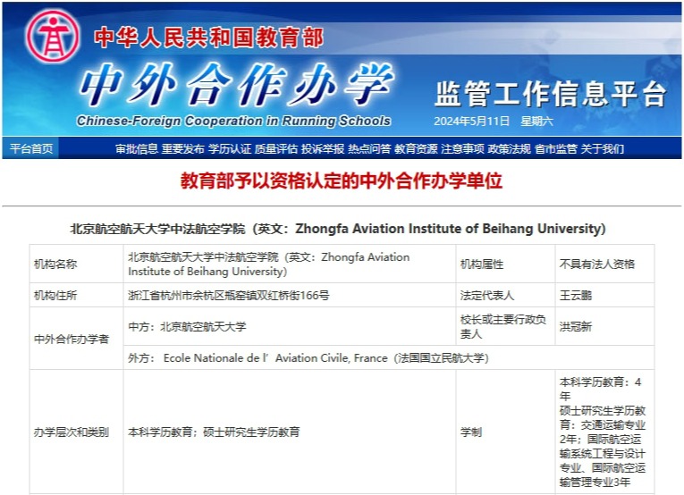 2023年4月22日,教育部批复同意设立北京亚洲成人在线一二三四五六区中法航空学院。